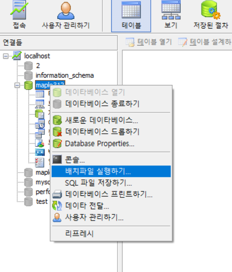 나비캣 카테고리 없음2020. 7. 9. 19:59 패스워드 root 입력 후 확인. (시험연결 해봐도 됨) 새로운 데이터베이스 만들기 데이터베이스명은 대충 maple316 치고 문자 셋을 EUC-KR로 설정 후 확인. 방금 만든 maple316... 왜 312지 암튼 따블클릭하면 초록색 불 들어옴 초록색 불 들어오면 마우스 우클릭하고 [배치파일 실행하기] 누르기. 아까 썼던 sql 파일을 불러와서 시작. 끝나면 종료 눌러주기. 공유하기 게시글 관리 Skin Test for Tistory Users 저작자표시 (새창열림)